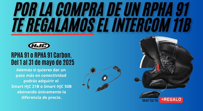 OFERTA RPHA 91 CON SMART HJC 11B DE REGALO ¡Llévate un Intercomunicador Smart HJC 11B GRATIS! En New Mundial Motos queremos premiar tu confianza: por la compra de un casco HJC RPHA 91 o RPHA...